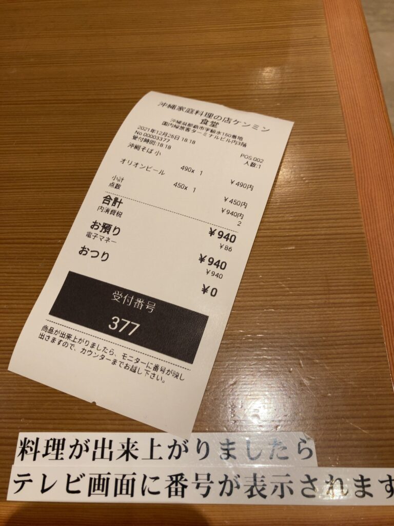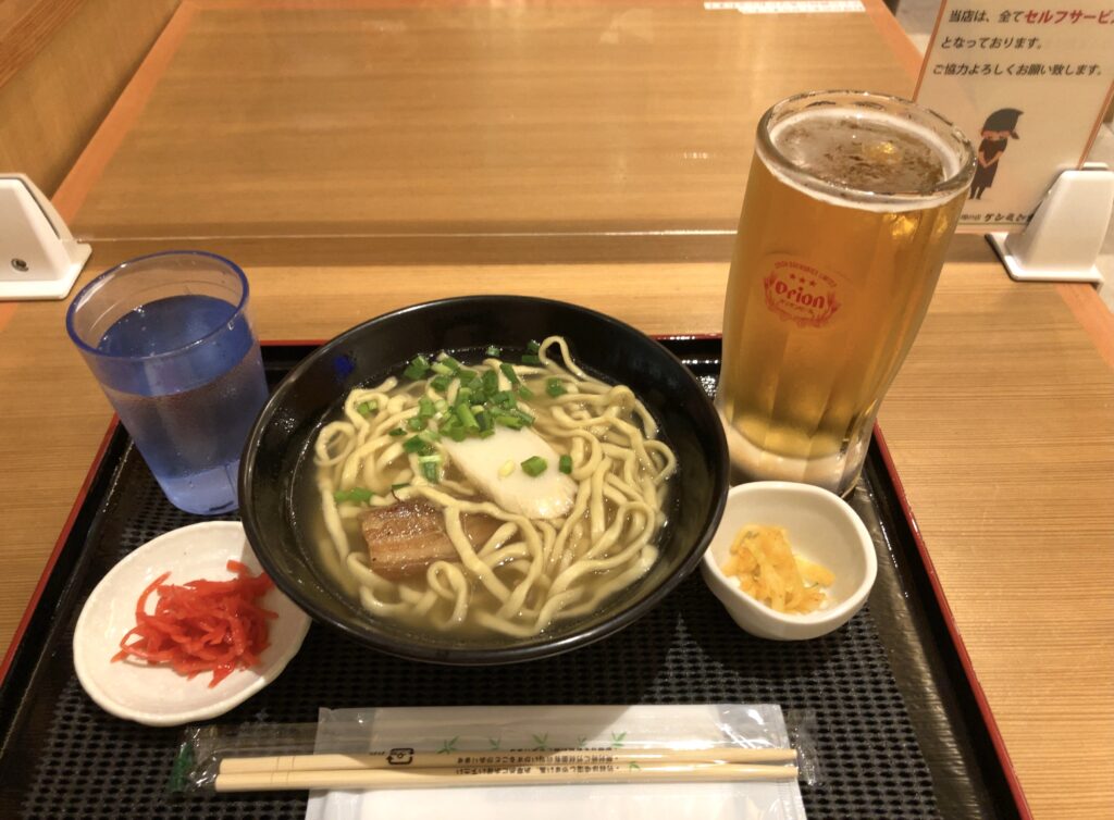 この旅、最初で最後となる『沖縄そば(小)』¥490-と『オリオンビール(ジョッキ)』¥450-を待ちます
