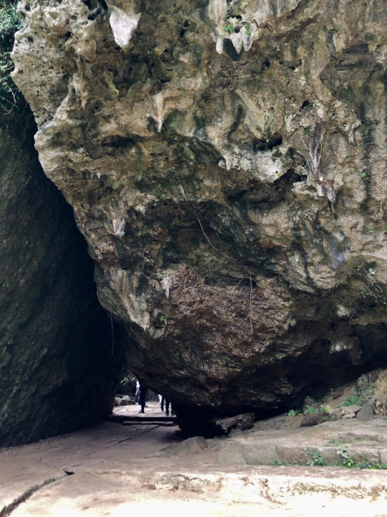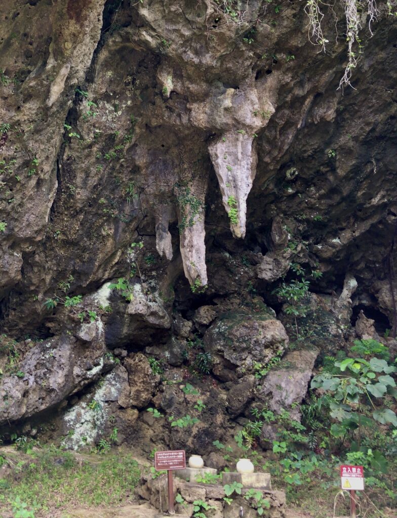 ↑垂れ下がった二本の鍾乳石から落ちる『聖なる水』を、下のツボが受け止めています